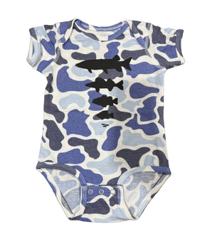 The Progression Onesie - Blue Old School Camo / 6M is backordered and will ship as soon as it is back in stock.